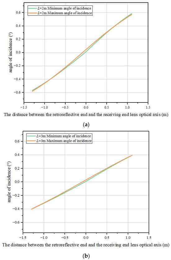 Under the conditions of lens focal length and lens diameter, the minimum incident angle and maximum incident angle of the light that can be received change as the retroreflective end moves, as shown in Figure 6. As the retroreflective end and the receiving end lens center light, the greater the distance between the axes, the greater the launch angle that can reach the receiving end, and the smaller the difference between the maximum incident angle and the minimum incident angle. As the link distance increases, the impact of the incident angle as the retroreflective end moves becomes smaller, the difference between the maximum incident angle and the minimum incident angle becomes smaller, and the movement range of the retroreflective end increases. Increasing the incident angle will lead to an increase in the offset of the light spot reaching the detector, so the larger the link distance, the smaller the requirement for the detector area. Therefore, appropriately increasing the link distance will help increase the movement range of the retroreflective end.
