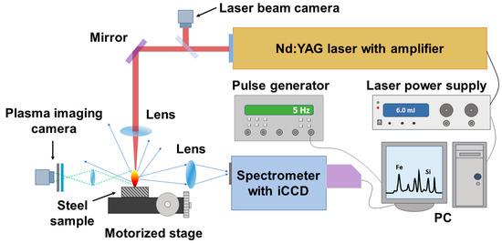 2 = 2. The laser ran at a 5 Hz rate. The plasma emission was collected from the side using a quartz lens located at double focal length from the plasma (F = 45 mm), so the plasma image was transferred onto the spectrograph slit at a scale of 1:1. A spectrograph (2400 grooves/mm, λ/δλ = 3500 Shamrock 303i, Andor, Andor Technology Ltd, Belfast, UK) was equipped with an intensified CCD camera (ICCD) (iStar, Andor, Andor Technology Ltd, Belfast, UK). An additional CMOS camera (acA1920-40um, Basler, Basler AG, Ahrensburg, Germany) was utilized to capture the time- and spectra-integrated plasma images (exposure time 500 µs, 350–800 nm spectral range). In order to monitor the shot-to-shot laser pulse energy repeatability, we installed a glass plate and measured the laser beam fleck using a CMOS camera (acA1920-40um, Basler, Basler AG, Ahrensburg, Germany). The laser and intensified CCD (ICCD) and CMOS cameras were synchronized using a digital pulse generator (DG-535, Stanford Research, Sunnyvale, CA, USA). The computer controlled the data acquisition with custom-written software developed in the LabVIEW 2014 environment (National Instruments, Austin, TX, USA). The sample was installed in a holder so that the lens-to-sample distance was the same throughout the experiments. The holder was built into a two-axis motorized stage (8MT173-30, Standa Ltd., Vilnius, Lithuania) to ensure the same lens-to-sample distance during sample movement. Low-alloy steel samples (see