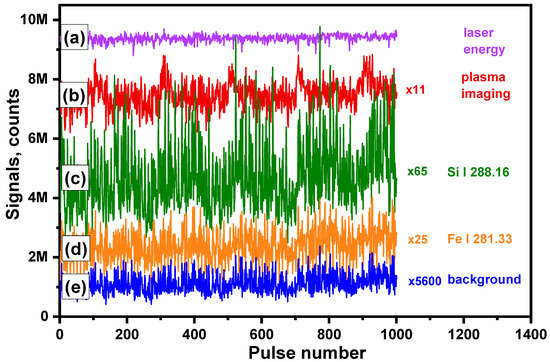 The datasets for laser pulse energy (in counts), plasma imaging signal, Si I 288.16, Fe I 281.33 and plasma background emission signals are presented in