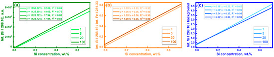 Figure 8a,c,e, the fulfillment of the 5% confidence limit was not achieved for single-shot LIBS spectra, i.e., the limit of detection for Si was greater than the 0.014% wt. value. However, spectra averaging improves the situation and LOD values should almost reach the 0.014% wt. values.