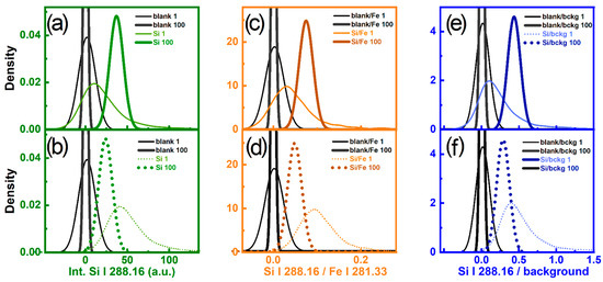Figure 8b,d,f), and its values were converted to silicon concentration by using the corresponding calibration curves. For a better view, we present distribution functions for the LIBS signal and corresponding blank only for single-shot and 100-shot averaging while we made a calculation for 5- and 20-shot averaging as well and present LOD values in