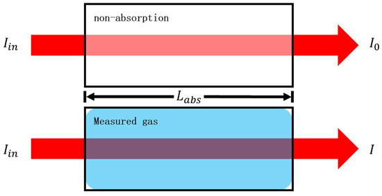 For a laser absorption spectral detection system, let the output light intensity be when the laser is transmitted without absorption and when it is transmitted with absorption. The effective absorption optical path is , the absorption coefficient related to the current pressure is , temperature is , wavelength is , and gas concentration is . The schematic diagram of laser absorption spectroscopy is shown in Figure 1.