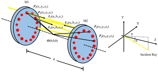 As shown in Figure 2, in the integrated cavity composed of two spherical mirrors, two concave spherical mirrors with a radius of curvature are placed coaxially at a distance . Incident light enters the integrated cavity at the incident point in the direction of the incident angle θ, φ. The incident laser beam is coupled into the cavity through the mirror in front of the cavity and reflects back and forth in the cavity until the laser energy is exhausted. Each reflection is taken as a separation, and Pn, Ln, and tn are the vectors from the origin to the n-th light point, the n-th direction vector, and the optical path of the n-th segment of light, respectively.