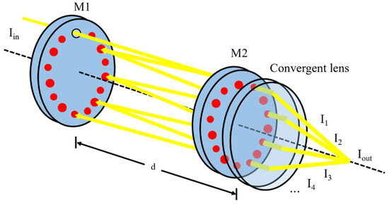 In this case, where off-axis incidence destroys the resonance effect of the cavity, the light intensity converged behind the cavity is approximately the sum of all transmitted light intensities. When ref represents the reflectivity, T represents the absorption rate of light through one pass, represents the energy leakage rate of the k-th light spot from the incident hole, and its output light intensity can be expressed as follows: