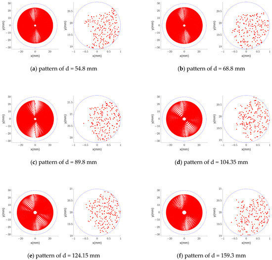 The design results of six direct-injection integrated cavities are shown in Figure 5. The incident laser is modeled as a set of 201 rays to simulate the pattern of light spots on the mirror’s surfaces. The left image of each result represents the point on the mirror where each light ray falls when the center light returns into the incident hole. The left image of each result represents the light escaping from the entry perforation during this process. Among this series of design results, because the number of reflections is controlled, the light ray deforms much more than the incident hole when it returns to the incident hole. The energy escaping from the incident hole is only about four-thousandths of the incident light energy. And the output light intensity can reach nearly half of the incident light intensity. The mirror distance varies from 54.9 mm to 159.3 mm, and the effective optical path varies from 50 m to 155 m. Such a large parameter range can effectively cover the detection needs in various fields.