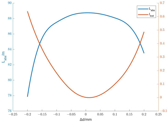 Because the optical path of a direct-injection integrated cavity is limited by the energy loss rate, the error has a unique effect on the performance of the cavity. As long as the light ray with high energy does not escape from the incident hole untimely, a slight change in the light spots’ pattern is of little effect. The following figure shows the relationship between Δd, the error of parameter d in design (c), the light energy loss rate Ilost and the effective absorption optical path Labs.