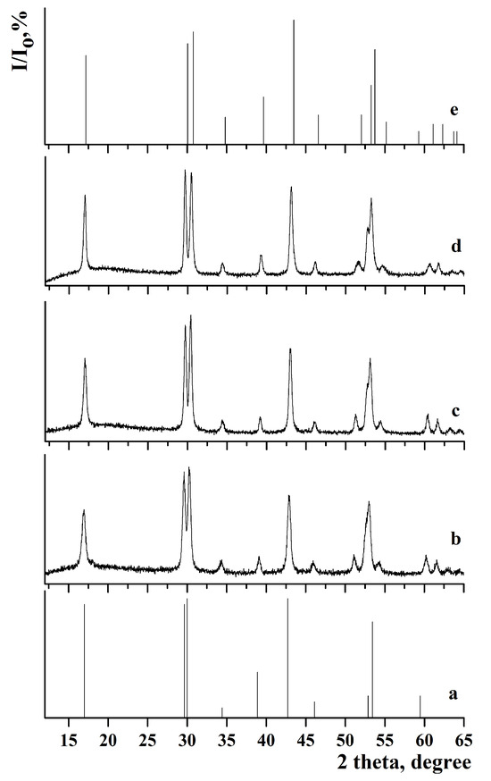 The determination of the phase composition of the synthesized samples was performed by X-ray powder diffraction (XRD) technique (D8 Bruker® Advance diffractometer with CuKα radiation, Bruker, Karlsruhe, Germany). The lattice parameters and coherent scattering region were calculated using TOPAS v.4.2 software. Particle size and morphology were analyzed by transmission electron microscopy (TEM, Jeol JEM-2100, Jeol, Tokyo, Japan) using ImageJ v.1.53e software.