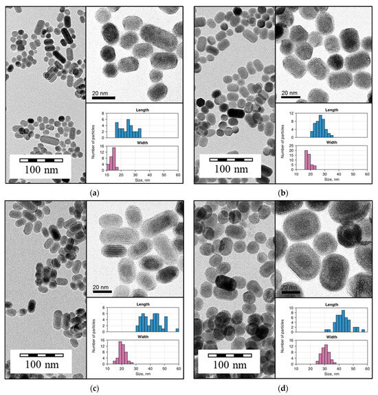 Micrographs obtained by TEM for (a) β-NaGdF4:Yb-Tm(30:0.5); (b) β-NaGdF4:Yb-Tm(30:0.5)@NaGdF4:Yb-Er(20:2); (c) β-NaGdF4:Yb-Tm(30:0.5)@NaYF4; and (d) β-NaGdF4:Yb-Tm(30:0.5)@ NaYF4@NaGdF4:Yb-Er(20:2). Inset: magnified TEM images with adjusted contrast; size distribution histograms for length and width.