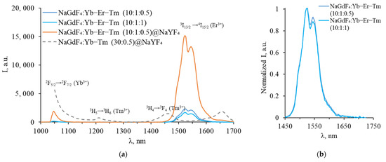 The luminescence spectra, measured in the SWIR range for Yb-Er-Tm tri-doped β-NaGdF4, are presented in Figure 5a. The synthesized tri-doped NPs exhibited 1050 nm (2F5/2 → 2F7/2 Yb3+) and 1540 nm (4I15/2 → 4I13/2 Er3+) luminescence bands in the SWIR range.