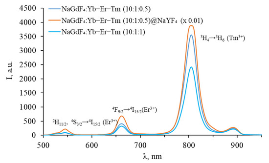 The β-NaGdF4 NPs were synthesized with tri-doping of rare earth ions Yb3+, Er3+, and Tm3+ at Yb:Er:Tm ratios of 10:1:0.5 and 10:1:1. Also during the step-by-step synthesis, a series of core–shell samples were obtained: (1) tri-doped with Yb3+, Er3+, and Tm3+ rare-earth ions core with Yb:Er:Tm ratio equal to 10:1:0.5 and 10:1:1 covered with inert NaYF4 shell; (2) NaGdF4:Yb-Er core covered with first NaGdF4:Yb-Tm shell, covered with inert NaYF4 shell; (3) NaGdF4:Yb-Tm core covered with first shell NaGdF4:Yb-Er, covered with inert shell NaYF4; and (4) NaGdF4:Yb-Tm core covered with first inert NaYF4 shell (intermediate shell), covered with NaGdF4:Yb-Er shell, covered with second inert NaYF4 shell. The doping concentration ratios of Yb:Tm and Yb:Er were chosen to be 30:0.5 and 20:2, respectively, according to the literature data and our previous study [64,65].