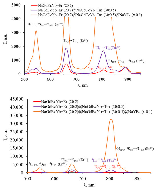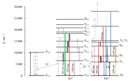 Er3+ and Tm3+ ions are promising for obtaining multicolor luminescence in various spectral ranges because their matching energy levels enable several resonant and non-resonant energy transfers and corresponding spectral tuning. To control the luminescence spectrum, it is necessary to optimize the interactions between ions in such a way that certain transitions are stimulated or suppressed [54]. The successful modulation of the VIS Er3+ emission for the Er3+–Tm3+ ion pair has been realized. After the introduction of Tm3+, the green emission of Er3+ (2H11/2 → 4I15/2, 4S3/2 → 4I15/2) decreased, while the red emission (4F9/2 → 4I15/2) increased due to the presence of the cross-relaxation process 3F4 (Tm3+) + 4I11/2 (Er3+) → 3H6 (Tm3+) + 4F9/2 (Er3+) [55]. This hypothesis was confirmed by a kinetic model that provided microscopic insight into the energy transfer pathways leading to spectrally pure emission in multi-doped UCNPs [56,57].