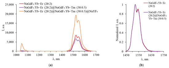 As can be seen from the obtained spectra, no characteristic Tm3+ luminescence peaks were observed in the SWIR range for tri-doped NPs. The luminescence bands corresponding to 3H4 → 3H6 and 3F4 → 3H6 Tm3+ transitions (near 1450 nm, and 1650–2000 nm) are absent in the spectra of tri-doped NPs. A two-fold increase in the Tm3+ concentration (up to 1%) did not significantly change the shape of the luminescence spectrum. As shown in Figure 4b, only a small decrease in the long-wavelength part of the Er3+ emission peak was observed, which could be attributed to energy transfer from Er3+ 4I13/2 to Tm3+ 3F4 or reabsorption of part of the Er3+ luminescence by Tm3+ ions. The integral Er3+ luminescence intensity at 1540 nm wavelength also decreases due to competition between Er3+ and Tm3+ for energy transfer from Yb3+. After the synthesis of the inert NaYF4 shell, the emission intensity increases dramatically, indicating that the shell separates activators from quenchers and defects on the NPs surface.
