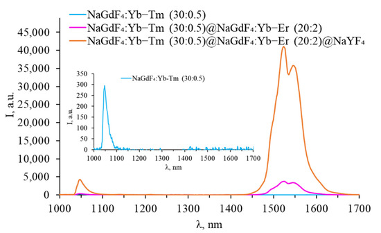Luminescence spectra of core–shell β-NaGdF4 (NaGdF4:Yb-Tm core covered with first NaGdF4:Yb-Er shell, covered with inert NaYF4 shell) in the SWIR range.