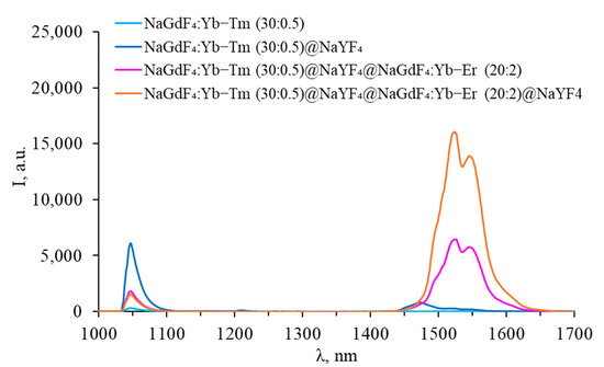 Luminescence spectra of core–shell β-NaGdF4 (NaGdF4:Yb-Tm core covered with first inert NaYF4 shell (intermediate shell), covered with NaGdF4:Yb-Er shell, and covered with second inert NaYF4 shell) in the SWIR range.