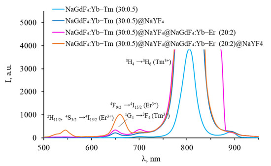 To separate Er3+ and Tm3+ ions and prevent energy transfer between them, particles with an inert intermediate shell were synthesized: β-NaGdF4:Yb-Tm core covered with a first inert NaYF4 shell (intermediate shell), covered with a NaGdF4:Yb-Er shell, and finally covered with a second inert NaYF4 shell. Spectra in the SWIR and VIS ranges are shown in Figure 12 and Figure 13, respectively.