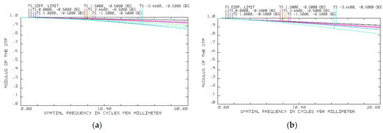 The MTF curves of the complete optical system are shown in Figure 11, and the MTF values of different wavelengths are all greater than 0.7 at the frequency of 20.8 lp/mm. The imaging quality is excellent and can meet application requirements.