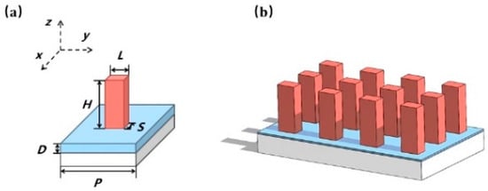 The polarizer structure design discussed in this paper. (a) Metasurface structural unit; (b) metasurface polarizer.