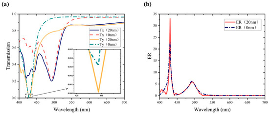 Comparison of the performance of the metasurface polarizers with TiO2 layers of 0 nm and 20 nm, respectively: (a) comparison of transmission spectra; (b) comparison of extinction ratios.