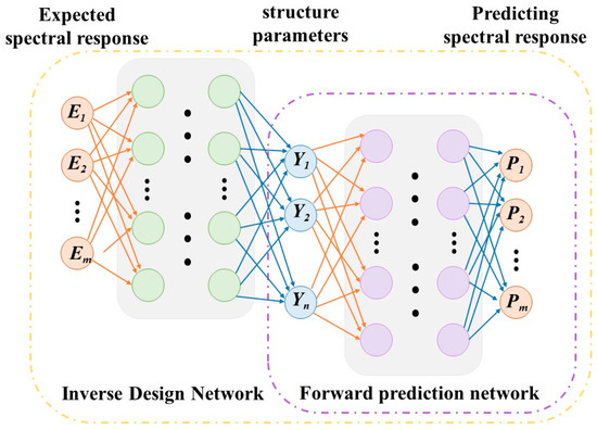 To address the issue of multiple metasurface structural parameters corresponding to a single spectral response, this study adopts a serial network structure, connecting the forward prediction network with the inverse design network, as illustrated in Figure 3. The first half of the network represents a conventional inverse design network, while the latter half is dedicated to the metasurface spectral prediction network. The entire serial network takes the expected spectral response as input, with the intermediate layer representing the designed metasurface structural parameters and the output reflecting the spectral response of the metasurface designed by the network. The final design result does not need to precisely match the actual design results in the dataset. The loss function will be low when the spectral response generated by the designed metasurface parameters is similar to the expected spectral response.
