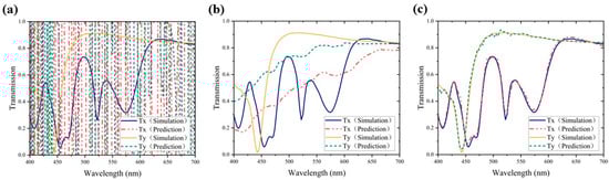 Finally, we input the desired spectral response data into the inverse design network, which outputs the corresponding metasurface structure parameters: a period of 290 nm, nanorod length of 70 nm, width of 50 nm, height of 260 nm, and TiO2 layer thickness of 10 nm. The metasurface structure designed through the network is simulated using Lumerical FDTD software to obtain its spectral response, and the extinction ratio is calculated for comparison with our specified target. As illustrated in Figure 9b, the solid lines represent our expected transmittance and extinction ratio, while the dashed lines represent the transmittance and extinction ratio of the metasurface structure designed by the network. The final designed metasurface polarizer achieves a maximum transmittance of 90%, and the extinction ratio reaches up to 40 dB. This closely aligns with our specified targets, meeting our expectations.