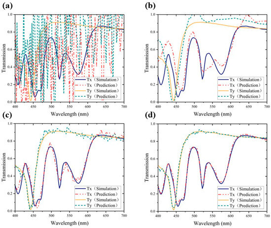 RMSprop, characterized by its adaptive learning rate adjustment for individual parameters, was employed to enhance optimization efficiency, with its prediction results shown in Figure 5a. Observing the prediction results reveals an extremely chaotic trend, lacking any obvious pattern. This indicates that the network fails to effectively learn the relationship between metasurface structural parameters and transmission spectra, possibly due to gradient explosions during network training, hindering RMSprop’s ability to adjust the learning rate effectively and resulting in extremely poor predictions. While Stochastic Gradient Descent (SGD) is well-suited for large-scale datasets, its convergence is characterized by a slow pace, and susceptibility to noise and outliers is pronounced. The predictions generated by SGD are depicted in Figure 5b. Although the prediction results exhibit a similar trend to the test data, the accuracy is compromised. This indicates that the network is more sensitive to capturing the general trend of data changes but struggles to predict actual values accurately. The use of the SGD gradient descent algorithm hinders capturing all patterns and relationships in the data, leading to less accurate predictions. Adagrad possesses the property of adaptively adjusting the learning rate for different types and sizes of data. Its prediction results, as shown in Figure 5c, are more accurate than the previous two methods in overall prediction, capturing the general contour of the spectral curve effectively. However, significant noise is present, and predictions are poor in the part of the curve where bending occurs. This phenomenon may be attributed to Adagrad’s sensitivity to certain parameters during the training process, resulting in noisy and unsmooth predictions in later stages when the learning rate of these parameters becomes smaller and is difficult to adapt to new data patterns. Since Adam utilizes both the first-order and the second-order moments of the gradient to adjust the learning rate for each parameter, overcoming, to some degree, some limitations of Adagrad is able to provide a more accurate prediction of the spectral curve. As shown in Figure 5d, the network’s prediction performance at this point is highly fitted and almost completely overlaps with the curve of the actual transmittance. At the peaks and troughs of the curves, the predictions also fit perfectly with the actual data. Therefore, we choose Adam as the gradient descent algorithm for the network.