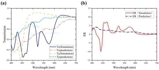 The extinction ratio is calculated using Equation (1) and compared with simulated values, as depicted in Figure 7. The high level of fit between the predicted and simulated extinction ratios showed that the network has a precise understanding of the intricate relationships in the data. Guided by the gradually diminishing MSE values, the predictive network constructed in this study successfully captured and simulated the intricate relationship between metasurface structural parameters and spectral response data. This demonstrated its outstanding learning capability. Upon calculation, the correlation coefficient (r) between the predicted values of the ResNet network and the simulated values reached 0.996. It is evident that a strong positive correlation exists between the actual values and the predicted values, indicating a high level of accuracy in the forward network predictions. The trained network can predict the corresponding spectral response within 0.8 s. In contrast, utilizing Lumerical FDTD requires an average simulation time of 2 min and 36 s. The efficiency improvement of the network in predicting metasurface performance can be calculated through Equation (4) as 99.48%.