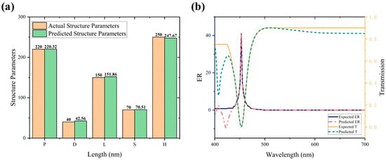 After successfully establishing the forward prediction network, its weights were fixed, and a complete metasurface inverse design network was constructed. Subsequently, the entire concatenated network was trained using the same activation function and optimization algorithm as the forward prediction network. After 1000 rounds of training, the loss function was only 1.18 × 10−5, and the correlation coefficient between the training data and the network’s predicted results reached 0.9999. A comparison between the metasurface structural parameters designed by the network and the validation set is shown in Figure 9a. The predicted structural parameters by the network exhibit minimal differences compared to the actual values, ranging from a minimum of 0.32 nm to a maximum of 2.56 nm. The impact on the spectral response is almost negligible. It can be seen that the inverse design network we constructed performs well in the design of metasurface structural parameters.