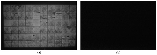 Figure 1. EL image of PV module: (a) under no sun illumination (solar irradiance = 0 W/m2); (b) under sun illumination (solar irradiance = 215 W/m2). The PV module was tested under voltage biasing at its 110% open circuit condition (V = 40 V), and under its short circuit condition (I = 7.2 A).