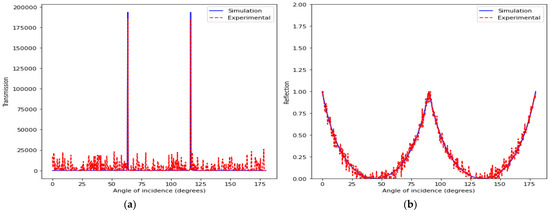 Reflectance measurements, shown in Figure 3b, reveal the complementary nature of the filter’s response. At angles where transmission peaks, reflectance reaches its minima, and vice versa. Notably, the experimental data demonstrates that the optimal angles for imaging—where reflectance is minimal, and transmission is maximized—are indeed between 25 to 50 degrees and 125 to 150 degrees. These findings are instrumental in confirming that the filter structure is finely tuned for EL imaging tasks.