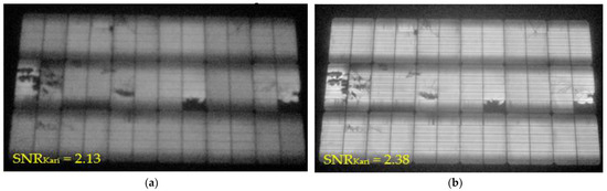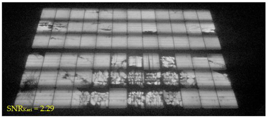 The noise level for the time series of a signal pixel is calculated using (1), and the signal level in (2), where N 1 and N2 are the number of samples in each subsample set μ 1 and μ 2 . In (1), the numerals ‘1’ and ‘2’ distinguish between two separate images captured in the field for each pixel of the EL imaging system. Specifically, these images are part of a dual-imaging protocol designed to enhance the robustness and reliability of the signal analysis. The noise calculation is made for every pixel time-series, p , in an image stack and combined as shown in (3), where a weighting scheme is used to mainly capture the SNR level primary form pixel with detectable signal. Including both positive and negative values of S decreases contributions from areas without signal, as the random offsets cancel out. This methodology enables the detection of signal presence and its relative quality without reliance on image cropping. A threshold of S N R K a r i 1 is indicative of an adequate signal for subsequent image analysis [22]. High-quality images, particularly challenging to obtain in outdoor EL testing, are defined by S N R K a r i > 4 . Typically, outdoor EL images yield S N R K a r i values ranging from 1.5 to 2.5 [23]. Conversely, S N R K a r i values below 1 are associated with poor image quality.