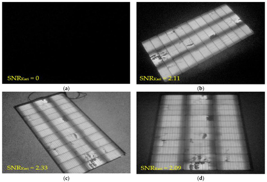 There is no discernible EL output when the angle is set to 55 degrees, Figure 5a, reflected in the S N R K a r i value of 0, indicating no EL signal was detected above the noise level. However, in the subsequent images, Figure 5b–d, the S N R K a r i values are all above 2. This consistent S N R K a r i performance is indicative of high-quality EL imaging output. These values substantiate the capability of the EL imaging system to produce clear and discernible images in outdoor conditions, with S N R K a r i > 2 demonstrating a robust signal that is well above the noise level, hence ensuring the reliability of the defect detection and the overall quality assessment of the PV modules under varying observational angles.