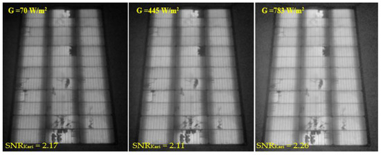 Considering now the impact of sun illumination on the output EL image quality. After testing the EL camera at different angles, images were captured for the same PV module at three different sun illuminations: low (70 W/m2), medium (445 W/m2), and high (783 W/m2), as shown in Figure 6. The results indicate that the output EL image is not as clear when captured under low sun intensity compared to medium-to-high sun intensity levels. The main reason for this is the echo of the bandpass filter and the natural density filter. Increasing the bandwidth of the filter design from 20 nm to 60–80 nm could improve this issue. However, this change would also affect the quality of the image captured under medium-to-high sun intensity.