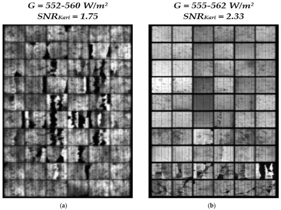 In addition to qualitative comparisons, a quantitative analysis has been employed to substantiate the superior performance of our EL imaging system. This was achieved by evaluating established metrics such as the contrast ratio and the S N R K a r i . A direct comparison of S N R K a r i values reveals that our system, with S N R K a r i = 2.33 , outperforms the system in [26], which reported S N R K a r i = 1.75 . This was achieved using the same PV module technology comprising 60-cell polycrystalline silicon PV, operating under approximately the same irradiance level. This quantitative data supports the visual analysis, confirming the system’s capacity to deliver higher-quality images under substantial solar irradiance. The improved detail captured in the images significantly enhances the detection, sizing, and classification of cell-level defects. Such precision is invaluable for conducting thorough diagnostics and ensuring the efficient upkeep of PV modules, ultimately reinforcing the performance and reliability of solar photovoltaic technologies.