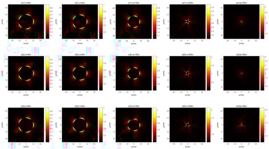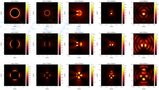 The intensity distribution of the x-polarization component of the first kind of propagational fractional vortex CAB with m = 2 at different distances. The first line (a1–e1), the second line (a2–e2), and the last line (a3–e3) show the cases when  is , , and , respectively.