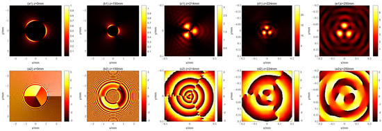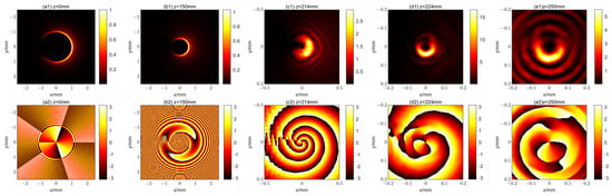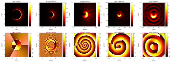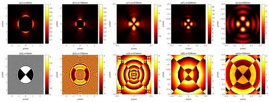 Substituting Equation (9) into Equation (7), we can obtain the evolution of the first kind of propagational fractional vortex CAB in free space. Since the polarization of the vector beam is inhomogeneous, we plot the intensity and phase distributions of the x-polarization component at different propagation distances for m = 0, 1, and 2, as shown in Figure 2, Figure 3, and Figure 4, respectively. From Figure 2, Figure 3 and Figure 4, it can be seen that the beam exhibits a 2m + 1 petal-like pattern, and the beam is able to propagate stably, which is quite different from the case shown in Figure 1. As mentioned above, the first kind of propagational fraction vortex CAB is in fact an (m + 0.5)-order vector beam with an OV having a TC of 0.5. Unlike m-order vector beams, which can be physically interpreted as combinations of left and right circularly polarized beams with a TC of ±m [,,], the phase distribution of the first kind of propagational fractional vortex CABs is not binary. For comparison purposes, we also give the propagation characteristics of a 2-order vector CAB, as shown in Figure 5. It clearly shows that a 2-order vector beam has a 4-petal pattern, and it has a binary (white and black) phase distribution initially. The first kind of propagational fractional vortex CABs maintain their shape during the propagation, meaning that the fractional-order OV does not influence their “non-diffraction” property. Due to the “abruptly autofocusing” property, the size of the beam becomes increasingly smaller, while the intensity becomes increasingly stronger, before the focus (z = 224 mm). It can also be seen from Figure 2(d1), Figure 3(d1), and Figure 4(d1) that the distance from the maximum intensity to the center of the beam at the focal plane increases as the value of m increases. Comparing the pattern before and after the focus point, we can see that the spot pattern is rotated. To observe the steady propagation of the first kind of propagational fractional vortex CAB, we give an animation of the evolution of the beam for m = 2, as detailed in the Supplementary Materials.