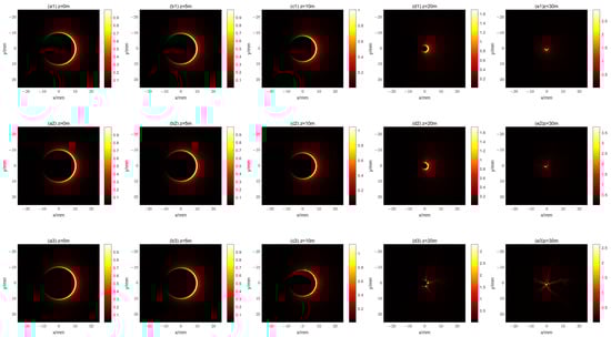 Employing Equations (11)–(14), we can obtain the propagation characteristics of the beam in a turbulent atmosphere. Figure 11 and Figure 12 give the propagations of the two kinds of beams for different values of . As can be seen in Figure 10 and Figure 11, the beam is able to maintain its shape unaffected under weak turbulence (). Figure 11 and Figure 12 also show that the beam retains its shape after propagating 20 m when , whereas the beam has already been deformed when .