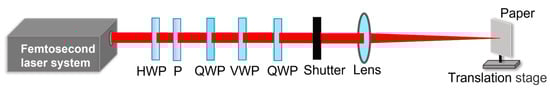 The schematic of our experimental setup to measure the self-focusing critical power is shown in Figure 1. The laser source was an amplified Ti:sapphire femtosecond laser system (Solstice Ace, Spectra-Physics, Milpitas, CA, USA) with a central wavelength of 790 nm, pulse duration of 65 fs, beam diameter of 9.5 mm (1/e2), a repetition rate of 1 kHz, and maximum pulse energy of 4.2 mJ. However, our experiment was carried out under the conditions of relatively low laser power, typically within the range of several GW, and a relatively large beam diameter. The potential influence of the focusing lens and other optical elements used in the experiment on the beam quality is considered to be negligible. A combination of a half-wave plate (HWP20-800B, LBTEK, Changsha, China) and a polarizer (WP25L-UB, Thorlabs, Newtown, NJ, USA) was used to adjust the laser energy. Subsequently, a vortex plate (VRx-800, LBTEK) and two quarter-wave plates (QWP20-800B. LBTEK) were employed to generate vortex beams. In order to control the exposure time, a shutter was positioned after the vortex beam generation system, set to a duration of 30 ms. A lens with a focal length of 500 mm was used to focus the femtosecond laser pulse in air. The pulse duration after optics elements used in our experiment was optimized by adjusting the compressor of the laser system through pre-compensating for the pulse dispersion introduced by the elements. The photosensitive paper, affixed to a translation stage, captured the focal spot generated by 30 pulses, which were controlled by a mechanical shutter (GCI-7103M, Daheng Optics, Beijing, China). Finally, the ablation patterns were recorded using a microscope (alpha300 R, WITec, Ulm, Germany).