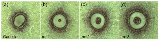 Typical ablation patterns by femtosecond (a) Gaussian and vortex beams with topological charge (b) m = 1, (c) m = 2, and (d) m = 3, respectively.