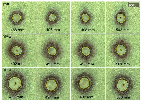 Ablation patterns of femtosecond vortex beam with m = 1 (250 μJ), m = 2 (350 μJ), and m = 3 (550 μJ) at several typical propagation distances.