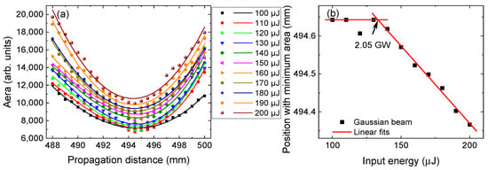 First, we evaluated the ablation patterns of the Gaussian beam, and then quantified the areas of the ablated regions using ImageJ software (Ver. 1.8) [46]. During the analysis, we maintained the same tolerance of 30 in the Wand Tool of the software. The Wand Tool of ImageJ software allowed us to select a contiguous area under the condition such that all pixel values in that area were within the range of the initial value ± tolerance. The ablation area can be automatically and properly selected by using this tool. For instance, the selected areas for the vortex beam patterns are marked by yellow lines in Figure 3. Subsequently, the area of the region of interest was calculated using the software. The results are plotted in Figure 4a, with the data being fitted using the polynomial fitting method. It is evident that for each input laser energy, there exists a minimum ablation area. Moreover, as the input energy increases, the position corresponding to the minimum area undergoes a shift towards the focusing lens, illustrating the manifestation of the self-focusing effect. Here, the displacement of the minimum area serves as an indicator of the movement of the beam focus. Hence, the determination of the critical power for self-focusing through the ablation method is also based on the measuring of the focus-shifting. Therefore, we followed the approach of the focus-shifting method [27]. The focus (minimum area) positions for various input energies are plotted in Figure 4b. The evolution of the position with a minimum area as the function of input energy exhibits the same trend as those obtained using the methods of focus-shifting and fluorescence measurement [27,39]. The position experiences negligible change when the input energy is relatively low, and then undergoes a rapid shift with further increases in input lase energy. To identify the deviation position, linear fittings were applied to the data. The intersection of the two red fitted lines can be considered the critical power point, from which the critical power for self-focusing of the femtosecond Gaussian beam can be obtained. The calculated critical power was approximately 2.05 GW. The value was very close to that obtained in our previous work by using fluorescence measurements [39].