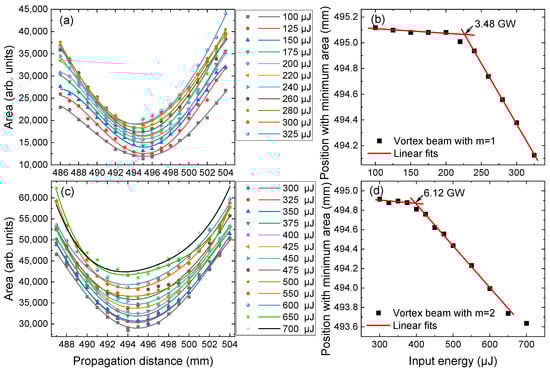 We then applied the method to the case of vortex laser beams. The results are shown in Figure 5. It is evident that the areas of the ablated spots by vortex beams with m = 1 and 2 have a similar evolution with the increasing input laser energy to that of Gaussian beam. By fitting the experimental data using polynomial fitting method, the positions with minimum areas were obtained and are plotted in Figure 5b,d for the two cases, respectively. A similar trend to the Gaussian case was observed. Hence, the same linear fitting method was used to find the deviation positions, indicated by the arrows in Figure 5b,d, and the critical powers for the self-focusing of the two vortex beams were successfully obtained, which were found to be 3.48 GW and 6.12 GW, respectively. These values are in good agreement with the values obtained in our recent study, where the critical powers for the self-focusing of vortex beams were determined through fluorescence measurements [39].