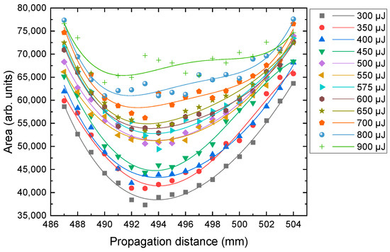 We extended the study to include a vortex beam with a higher topological charge m = 3. The areas of ablated spots were evaluated and are plotted in Figure 6. We can see that the areas start to show irregular evolutions with the increase in input energy, compared to the above three cases. Especially for higher input energies, the data have much bigger fluctuations along the propagation direction. The polynomial fitting lines are not reliable any more. The R2 of the fitting becomes worse with the increase in input energy, and it is only 66% for 900 μJ case. Under this condition, it is hard to find a position which has the minimum area. This phenomenon is similar to what we observed in our previous work [39], where the fluorescence peak position of air ionization became worse with the increase in the topological charge (as can be seen from Figure 6 in the Ref. [39]). The main reason for this should be that the non-uniform distribution of laser intensity in the ring-shape cross-section of vortex beam influences greatly the focus-shifting process [39]. On the other hand, the coincidence is not surprising, because both the ablation method proposed in this study and the fluorescence measurements obtained using CCD imaging used in Ref. [39] are basically the measuring of the focus shifting. Therefore, it can be concluded that the method is not applicable for vortex beams with higher topological charges either.