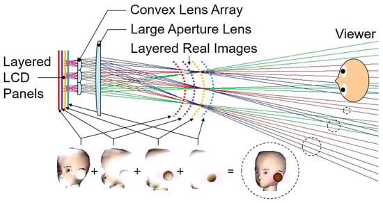 However, the effect of stereoscopy in a CII display depends on the parallax offered by multiple views, which can limit its capability to present the 3D images with substantial depth. To address this limitation, a CIVI has been introduced that combines the multi-view approach of CII with a volumetric solution [14]. In this configuration, instead of a single-layer display panel, multiple layers of transmissive LCD display panels are utilized. As illustrated in Figure 2, this arrangement generates multiple real image planes in the air through the lenses. Different sections of the 3D model are displayed on different LCD panels according to their z-axis positions. Due to the sequential passage of light through multiple LCD layers from the light source, rendering the unused pixels on each panel as white enables the viewers to perceive layered real images of the 3D model. To achieve the representation of pixels between discrete image planes, a depth-fused 3D (DFD) approach [25,26,27] is applied.