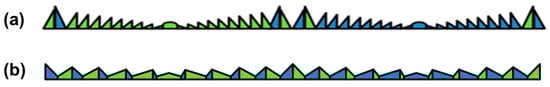 A common problem with both CII and CIVI is the distinct seam between view images caused by the connecting segment of each elemental lens in the coarse lens array. In order to address this issue, Kakeya et al. proposed an interleaved structure to be used in the seam area of the elemental Fresnel lenses. The elemental prisms for the left and right lenses are interleaved at the connecting part of the elemental lenses, as illustrated in Figure 3a, which effectively lessens the distinctness of the seam between adjacent lenses [16]. The interleaved part can be extended to cover the entire lens to eliminate the seam further, as shown in Figure 3b [17]. In this case, the entire elemental lens is interleaved with tiny elemental prisms for the left and right lenses.