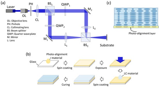 As depicted in Figure 7b, there are basically five steps to fabricating the PBL. Initially, the photoalignment material, e.g., brilliant yellow (BY), was dissolved into a dimethyl-formamide (DMF) solution and spin-coated onto a glass substrate. Following this, the photoalignment material underwent exposure in the above MZI using a 457 nm laser, with the effective exposure focal length set at 1 m for a wavelength around 532 nm. After the exposure, reactive mesogen RM257 was employed to generate LC layers through spin-coating. Finally, the device is exposed to UV light for stabilization. To achieve a broadband spectrum for all the input RGB lights, a multi-twist structure [31] was used, as illustrated in Figure 7c. There are basically three LC layers. The incorporation of a chiral dopant in the LC mixture facilitates the formation of a helical structure within the first and third LC layers.