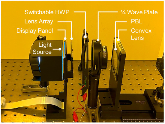 Figure 8 illustrates the breadboard display systems, comprising a light-emitting diode (LED) light source, an LCD panel, a lens array, a switchable HWP, a QWP, a PBL, and an additional convex lens. Specifically, we utilized a portable 3.1-inch in-plane-switching (IPS) LCD panel (by Kyocera) with 800 × 480 resolution, 0.084 mm pixel pitch, and 120 Hz refresh rate as the display panel. An active shutter glass from NVIDIA 3D Vision 2 Wireless Glasses, designed to operate at a 120 Hz refresh rate, serves as the switchable HWP. The polarization films laminated to both sides of the glass panel were removed. The focal lengths of the PBL and the convex lenses were ±1000 mm and 100 mm, respectively. The equation for the two combined thin lenses is given by
