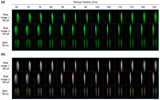 Three sets of photos were taken under three conditions: real image 1 generated without TM (first row), real image 2 generated without TM (second row), and both real images generated with TM (third row), as Figure 10 shows. Captured photos of the line on the diffuser screen exhibit reduced blurriness on specific occasions when the diffuser is positioned near the focal plane of the combined lens. Clear moments of real images 1 and 2 can be observed at different positions: approximately 90 mm and 110 mm. The camera parameters for the SONY ILCE-6100 are provided in Table 1. Considering the higher intensity of the white line compared to the green one, we adjusted the ISO value of the camera while capturing the latter.
