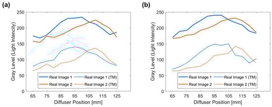 To examine and visualize the convergence of light rays, we plotted the light intensities of the horizontal center lines of photos in Figure 10 at different z-axis positions (Figure 11). The horizontal coordinates in Figure 11 represent the lengths of each center line (unit: pixels) corresponding to the width of each elemental image in Figure 10. The intensity data for the experiment are derived from the gray levels of the photos, as the relative relationship between these levels is sufficient for finding the focal plane. As shown in Figure 11, converging points of light rays, represented by the thinnest and brightest parts, were identified at different positions, indicating the generation of two focal planes. We plotted the maximum intensities for each center line at different z-axis positions, as can be seen in Figure 12. The peaks of lines for images 1 and 2 appear within a distance of 10–15 mm, which is reduced to 5–15 mm when the TM is activated. Such a reduction is attributed to the activation of TM, which introduces additional crosstalk.