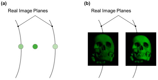 To achieve volumetric imaging, we employed the DFD method with two focal planes [25]. In the DFD approach, 3D pixels are represented using two adjacent panels, and each panel emits light inversely proportional to the distance between the 3D pixels and the panel itself, as illustrated in Figure 13a. Utilizing the DFD method, we computed the density of each pixel on the two image planes to generate volumetric stereoscopic images of a 3D model of a skull, as depicted in Figure 13b.