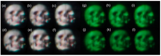 Images generated by the proposed CIVI observed from different viewing positions: (a–f) white images; (g–l) green images; and images observed from (a,g) upper-left, (b,h) upper-center, (c,i) upper-right, (d,j) lower-left, (e,k) lower-center, and (f,l) lower-right viewpoints.